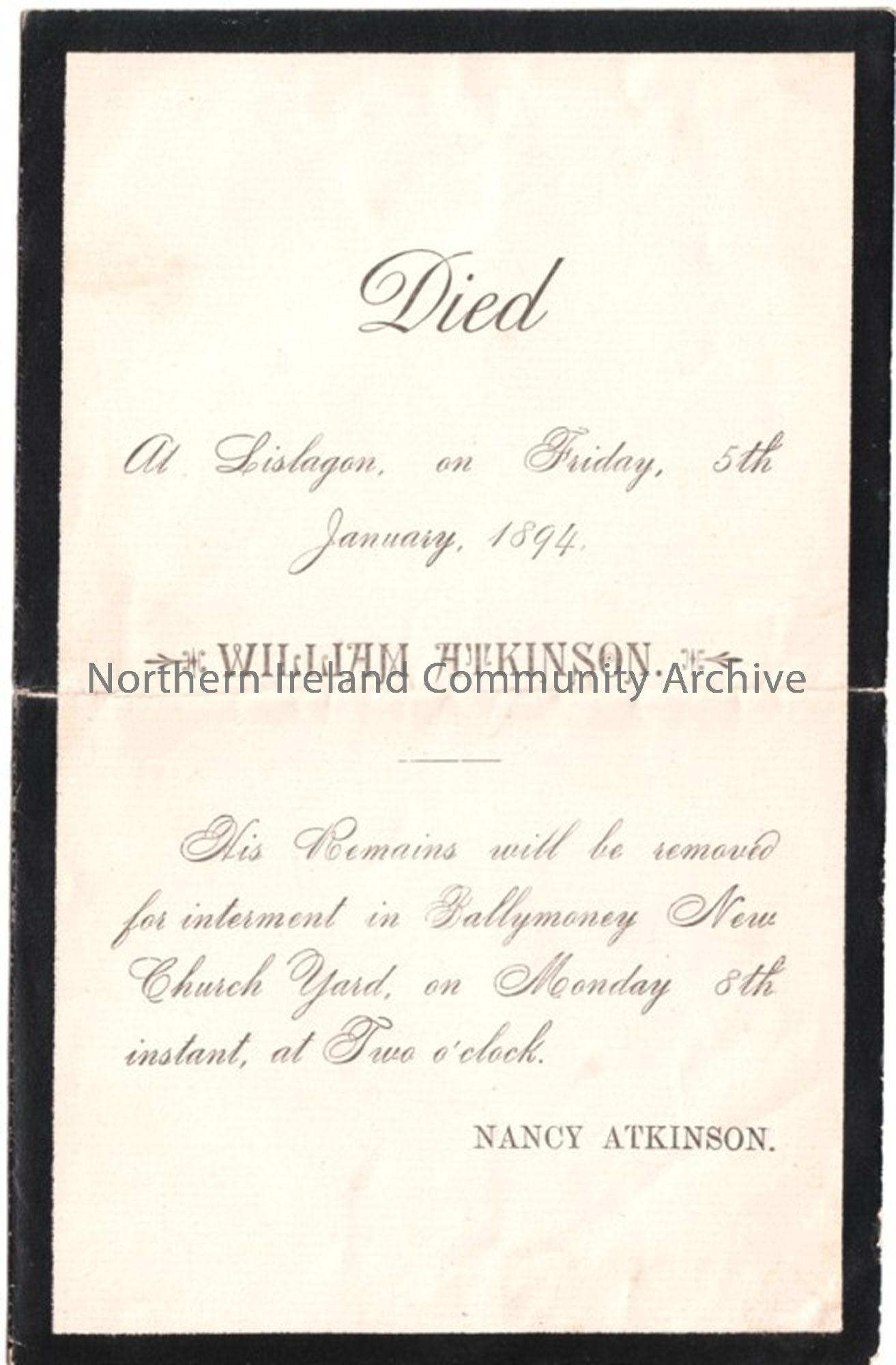 William Atkinson of Lislagan, buried in Ballymoney New Churchyard d. 5th January 1894