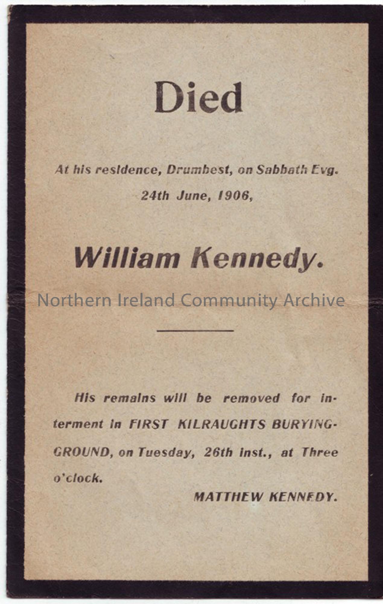 William Kennedy of Drumbest, buried in First Kilraughts Burying Ground d. 24th June 1906