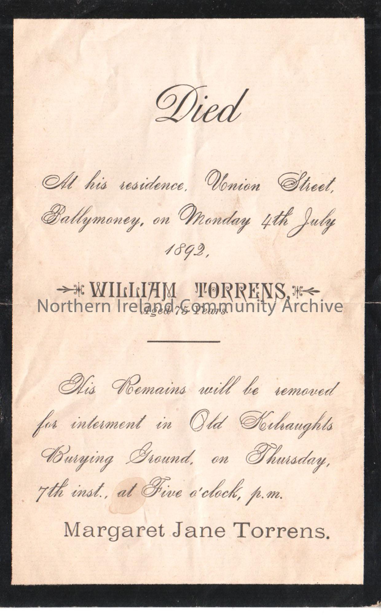 William Torrens of Union Street, Ballymoney, buried at Kilraughts Old Burying Ground d. 4th July 1892, aged 75 years