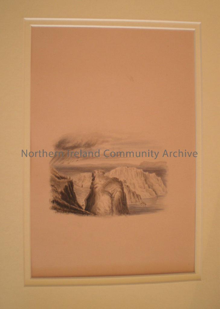 Window mounted watercolour painting of Carrick-A-Rede with the fishermen’s cottage and Rathlin visible. This painting comes from an album dated 1838, … – C1