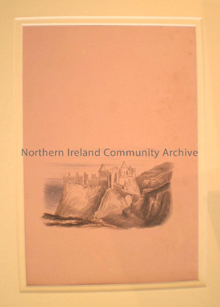 Window mounted watercolour painting of Dunluce Castle. This painting comes from an album dated 1838, made by Marcus Ward & Co, Belfast and is intialle… – D1