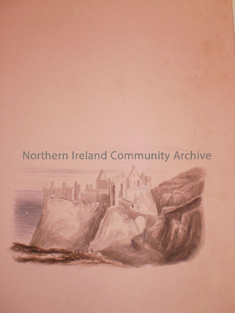 Window mounted watercolour painting of Dunluce Castle. This painting comes from an album dated 1838, made by Marcus Ward & Co, Belfast and is intialled "W.Mc.I.", presumably Dr William McIlwaine, Rector of St George's Church, Belfast. He was a Member of the Royal Irish Academy and was a contributor to "Kottabos". He published a volume of Sacred Irish Poetry which Oscar Wilde contributed in 1879, as well as other secular poetry including "A Vision of Italy" in 1860.