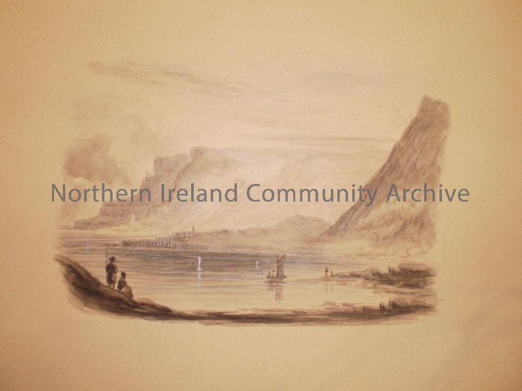 Window mounted watercolour painting of the Giant's Causeway, including scenery, people and boats. This painting comes from an album dated 1838, made by Marcus Ward & Co, Belfast and is initialled "W.Mc.I.", presumably Dr William McIlwaine, Rector of St George's Church, Belfast. He was a Member of the Royal Irish Academy and was a contributor to "Kottabos". He published a volume of Sacred Irish Poetry which Oscar Wilde contributed in 1879, as well as other secular poetry including "A Vision of Italy" in 1860.