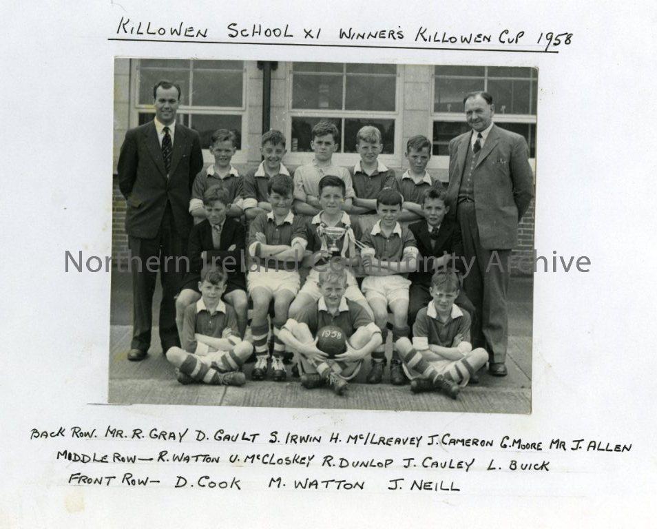 Killowen School XI, Winner's Killowen Cup, 1958; Back Row: Mr. R. Gray, D. Gault, S. Irwin, H.McIlreavey, J. Cameron, G. Moore, Mr J. Allen. Middle Row: R. Watton, U. McCloskey, R. Dunlop, J. Cauley, L. Buick. Front Row: D. Cook, M. Watton, J. Neill