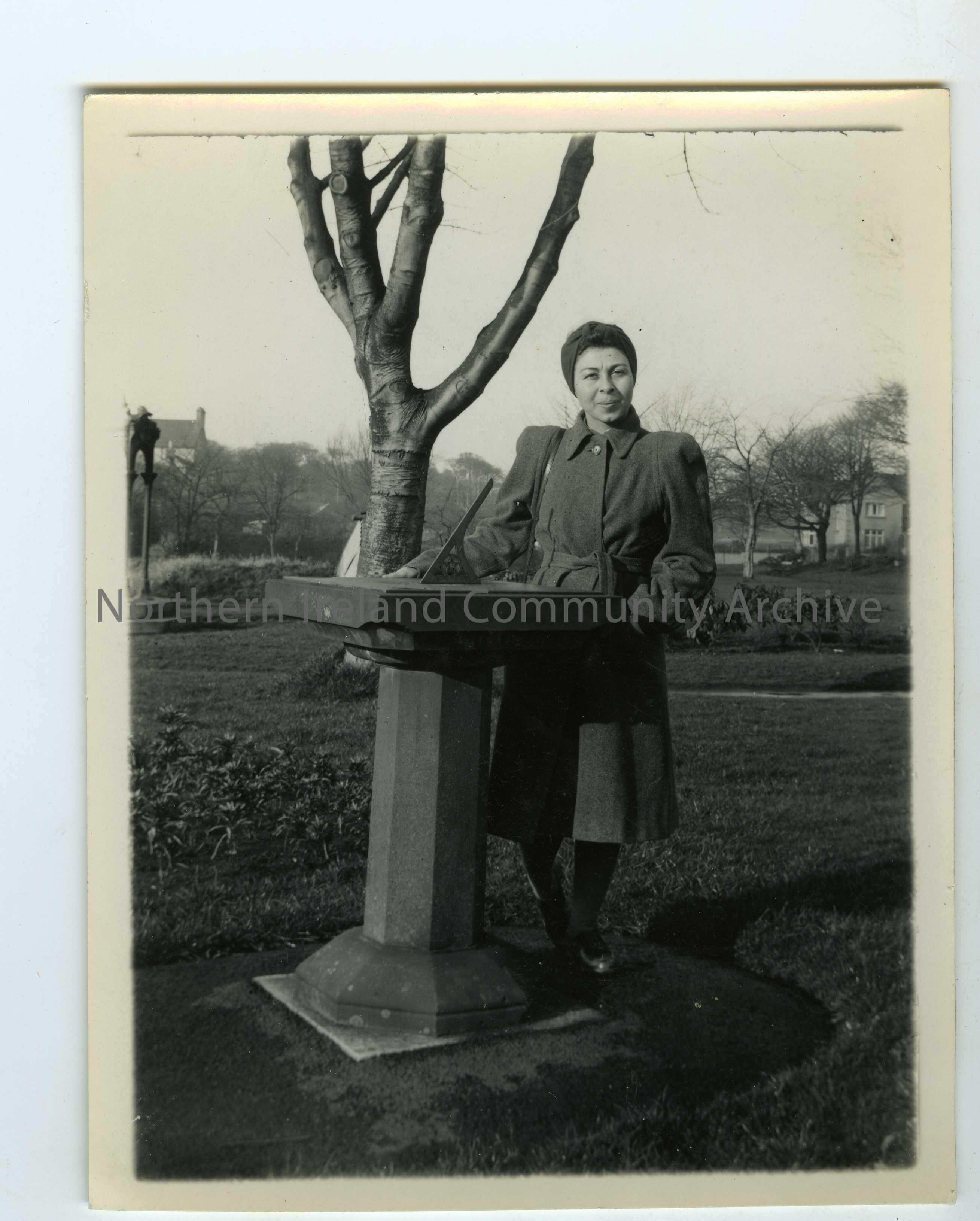 Woman standing to the right of a sundial in Anderson Park, Coleraine. Captioned, ‘Mrs Bercoff’.