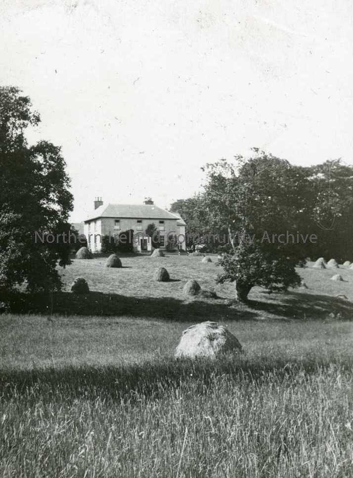 Semi-rural scene - House on hill - Woodbank, Garvagh. Robert Obilby (1790-1846), bleacher, owned the bleach field at Garvagh; resided at Woodbank, Garvagh; and donated the local village school. Robert Ogilby was the son of Alexander Ogilby of Catherine Street, Limavady, and of Mary Alexander, daughter of James Alexander, of Roe Park, now a hotel on the outskirts of Limavady.