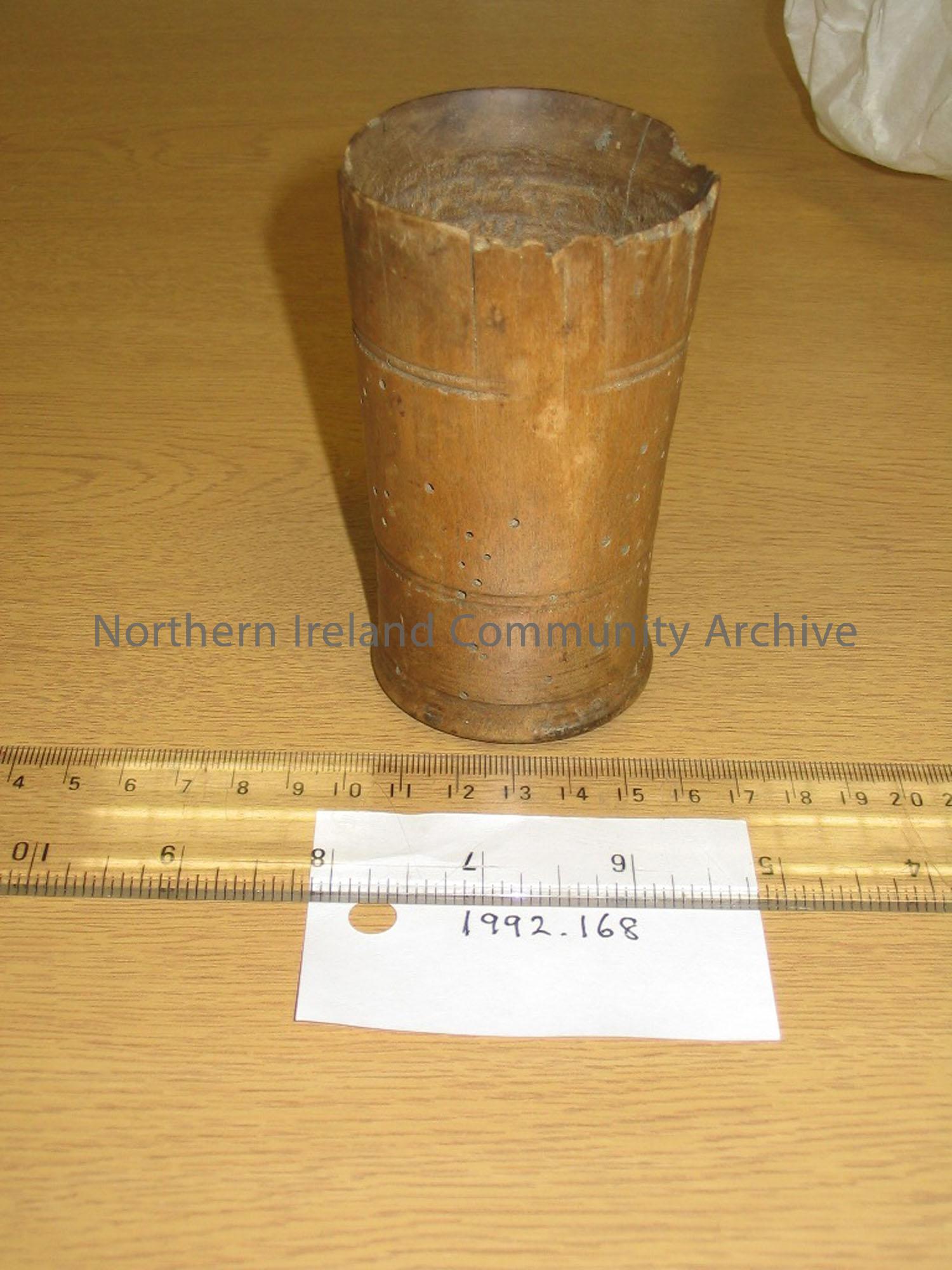 wooden goblet, lip of vessel chipped and evidence of wood worm.