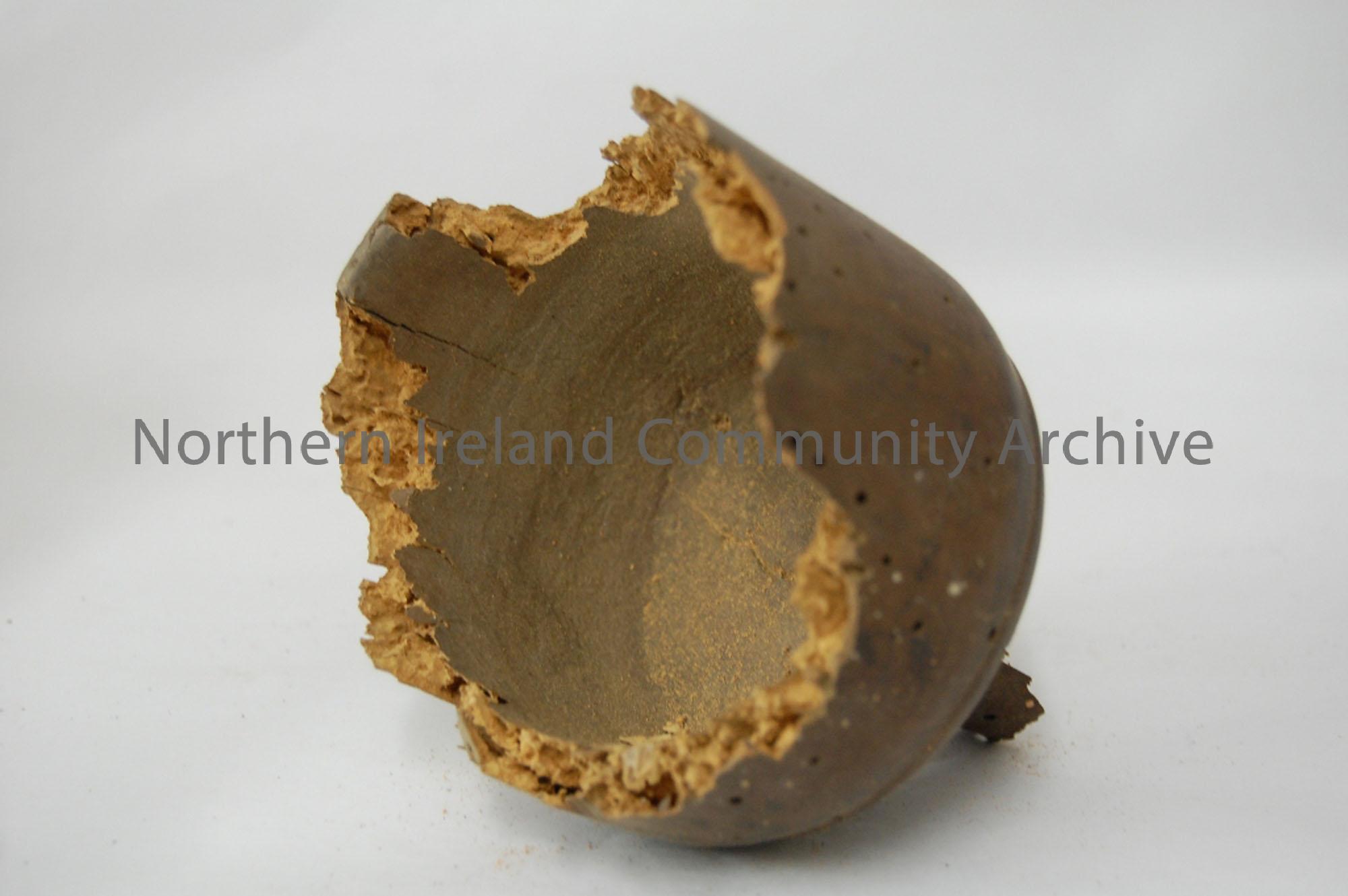 wooden, Majority of the vessel is missing including base and rim, evidence of wood worm.