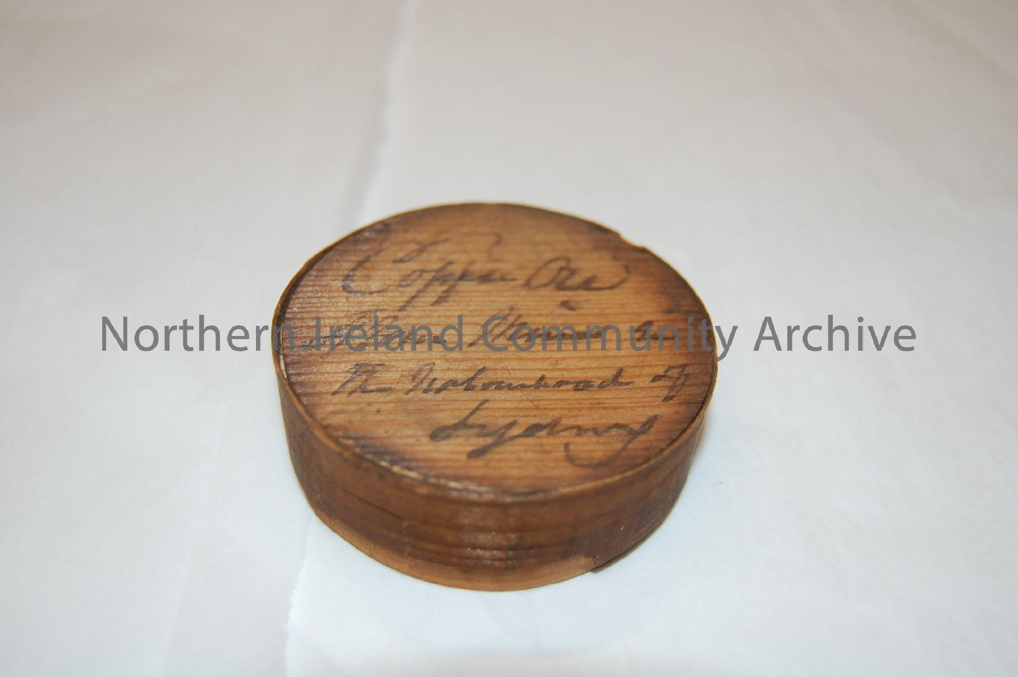 wooden mineral sample box. Flimsy cylindrical box with the top fitting over the base.