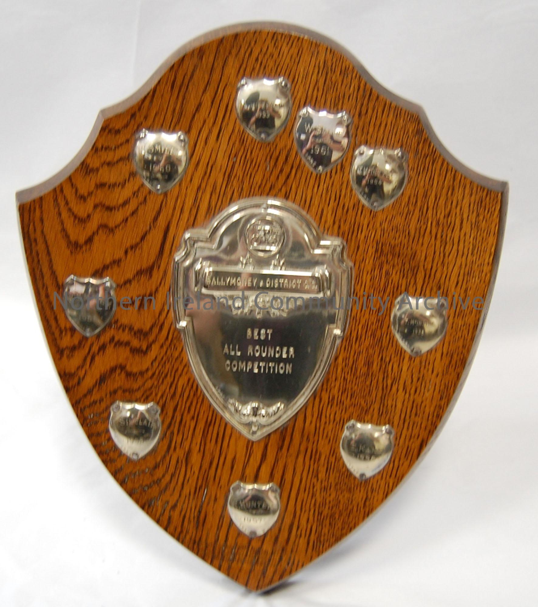 Wooden shield with smaller metal plaques naming winners of shield 1955-1976. Central shield engraved 'Best All Rounder Competition'. Stand attached to the back made of wood. Also attached are two wall hooks.