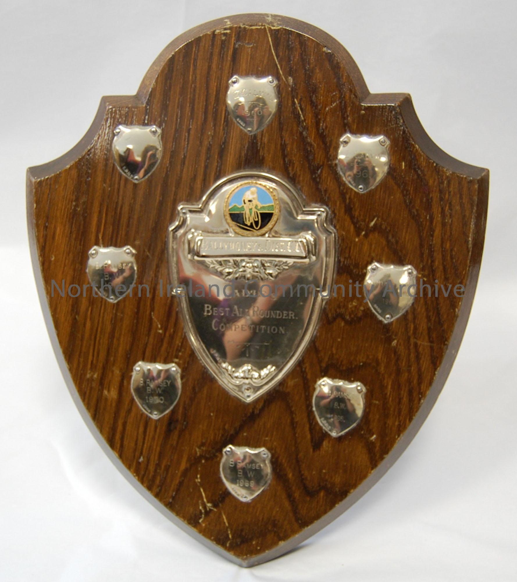 Wooden shield with smaller metal plaques naming winners of shield 1960-1971. Central shield engraved 'Ladies Best All Rounder Competition'. Stand attached to the back made of wood. Also attached are two wall hooks.