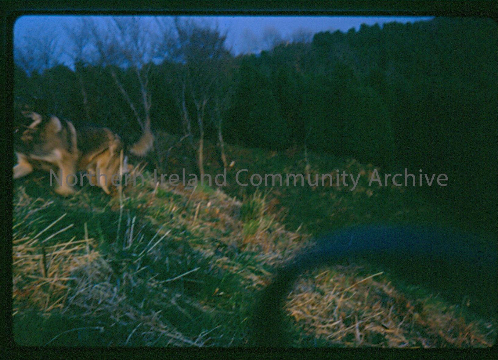slide depicting field or woodland with dog. Slide numbered 29 and dated May 1973