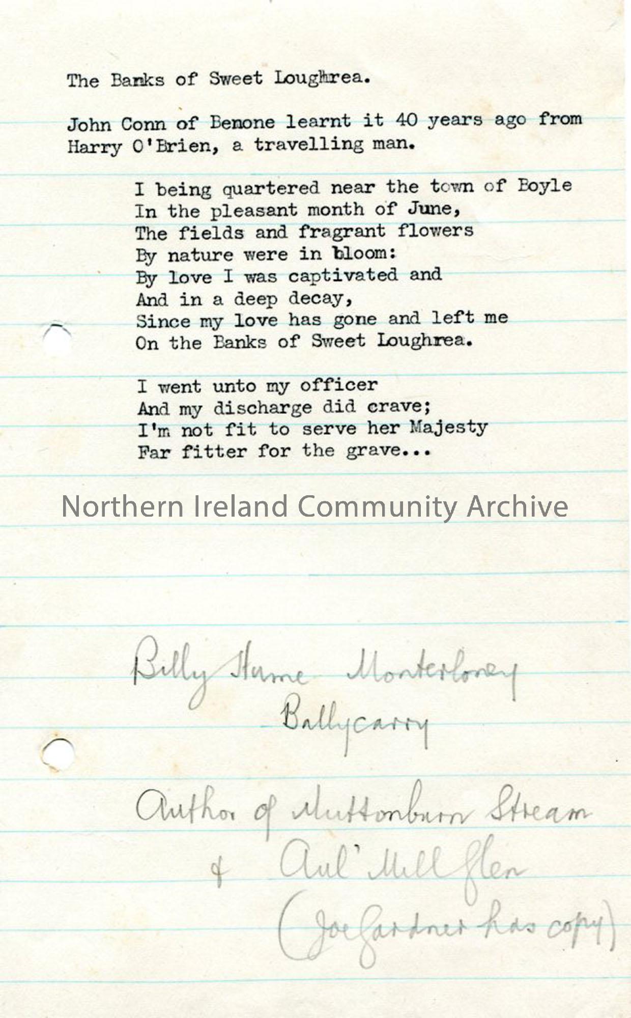 Typed words to 'The Banks of Sweet Loughrea'. Mentions Boyle. Some handwritten notes. Donor is John Conn, Benone who learnt it from Harry O'Brien, a travelling man, 40 years before.