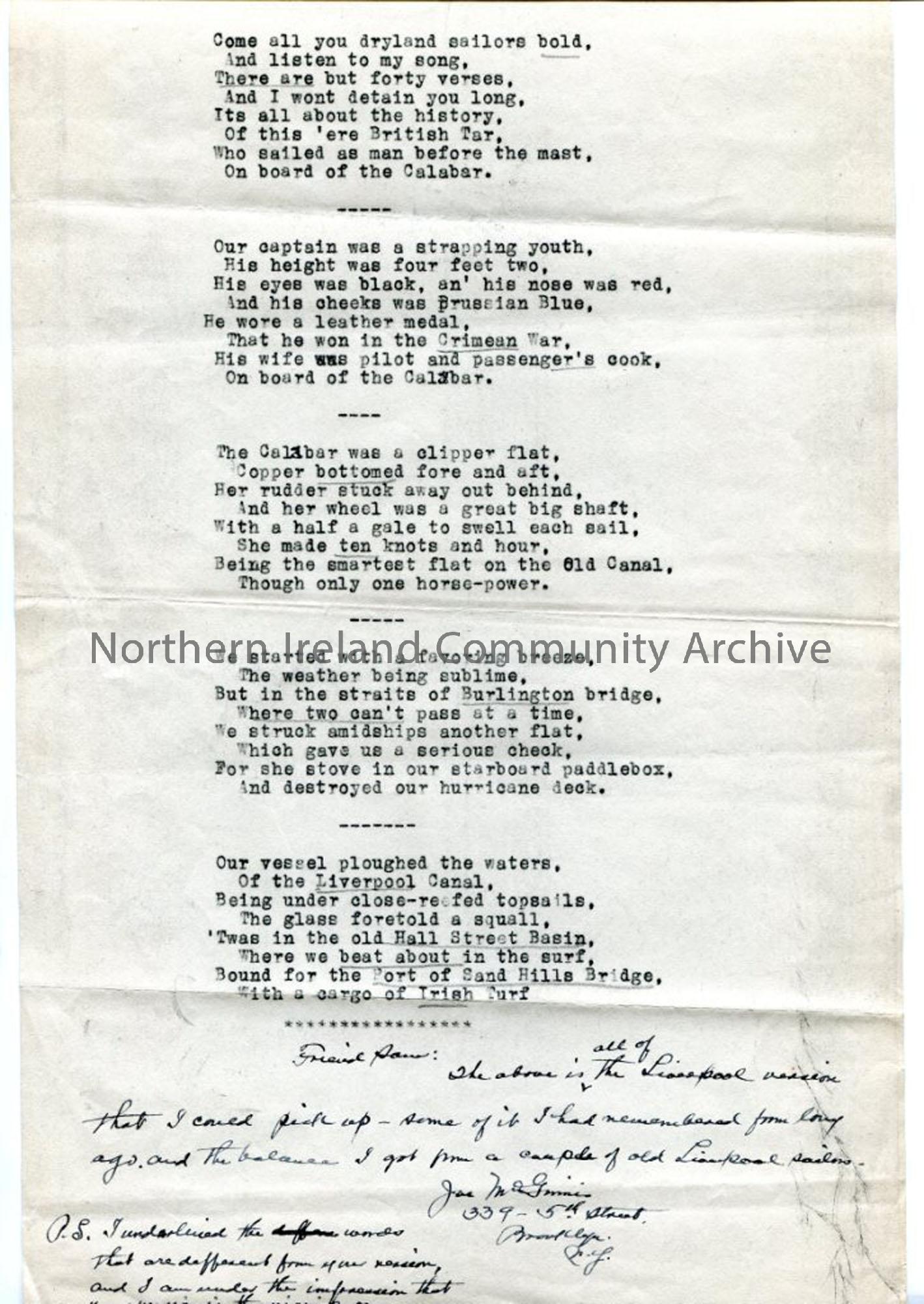 Words to alternative version of 'The Cruise of the Calabar', with handwritten note from Joseph to Sam at the end. One of a bundle of documents pinned together, from Joseph McGinnis, who had a keen interest in songs sung by sailors.