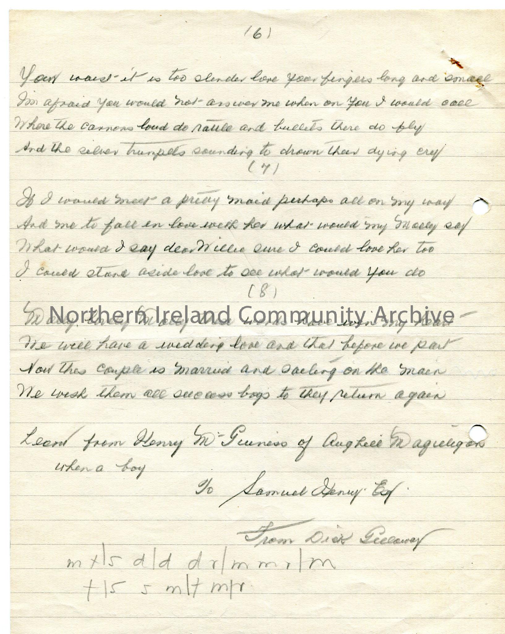 Words to untitled work, with some simplistic tonic sol-fa notation at the end. Handwritten in pencil - musical notation in different hand and pencil