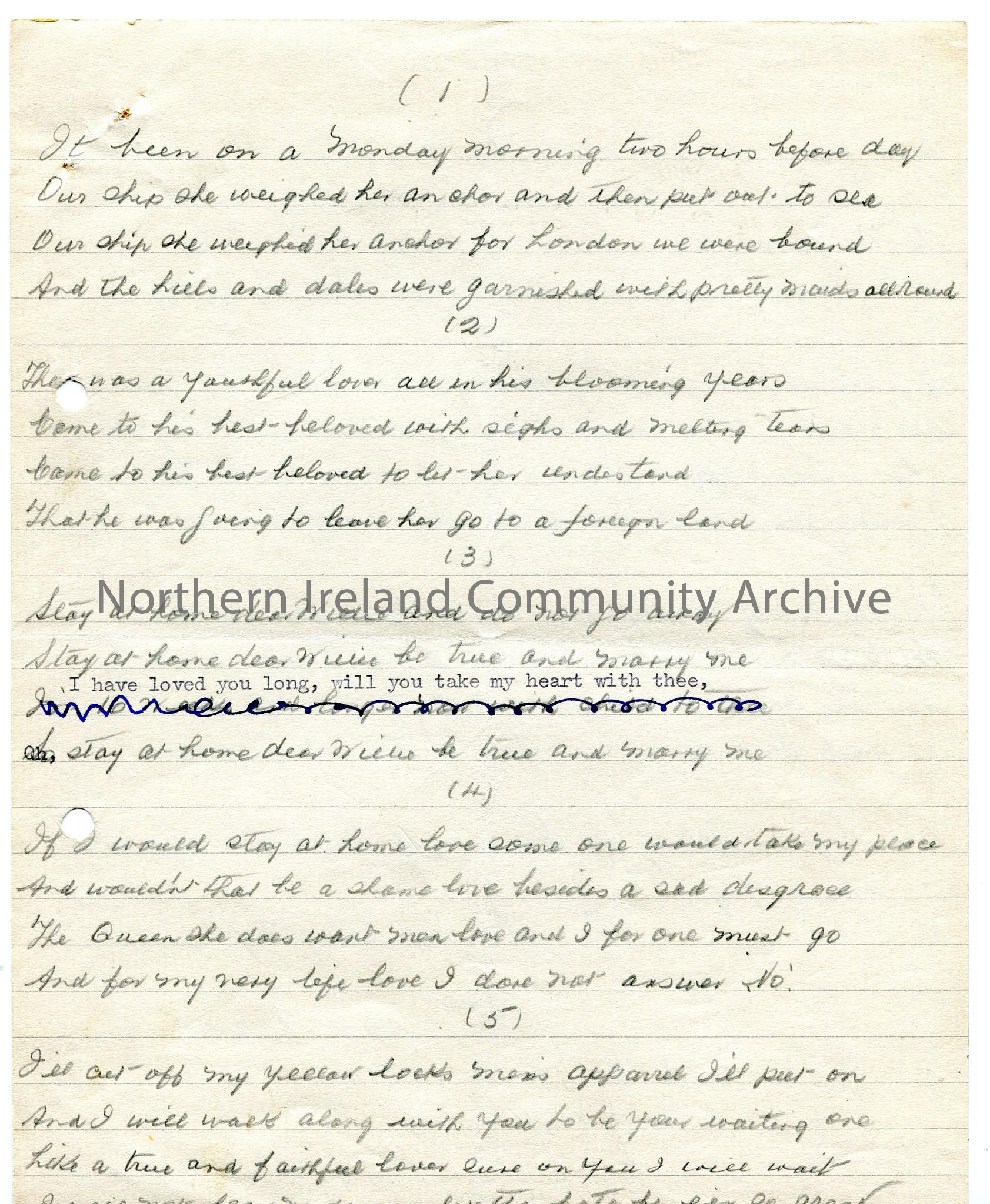 Words to untitled work, with some simplistic tonic sol-fa notation at the end. Handwritten in pencil - musical notation in different hand and pencil