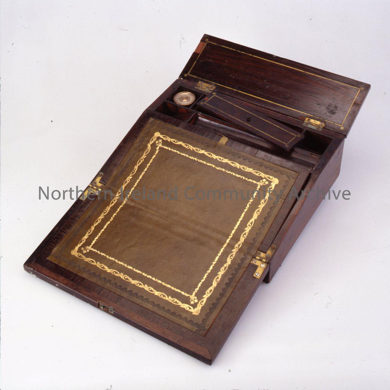 Victorian wooden writing box, with brass inlaid decorations. There is a griffon on the front of the box with the name 'Miss Mc.Burney.' This box belonged to Miss Jane McBurney, she received it when she was 21 years of age (born 1806 and 21 in 1827) The box opens to the front revealing a green leather decorative writing surface and compartments for ink pots and other materials to top. There is a secret compartment underneath the leather writing surface. This box was given to Reverand J.A. Canning by the members of his Bible class on January 1853.(HP - where did this last peice of info come from 05.01.10)