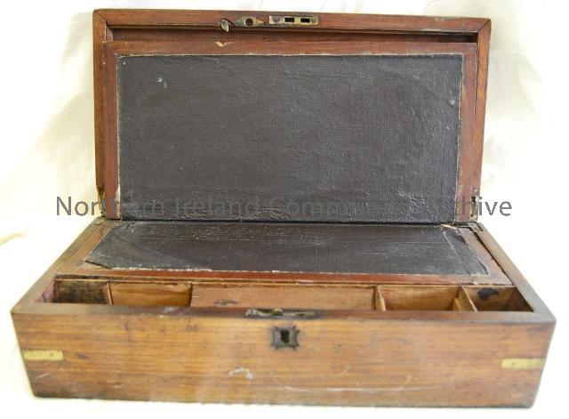 Inside of Writing box. Polished mahogany writing box or slope with brass bindings and brass lock. The writing surface is covered in American oil cloth. Courtesy of Ballycastle Museum.
