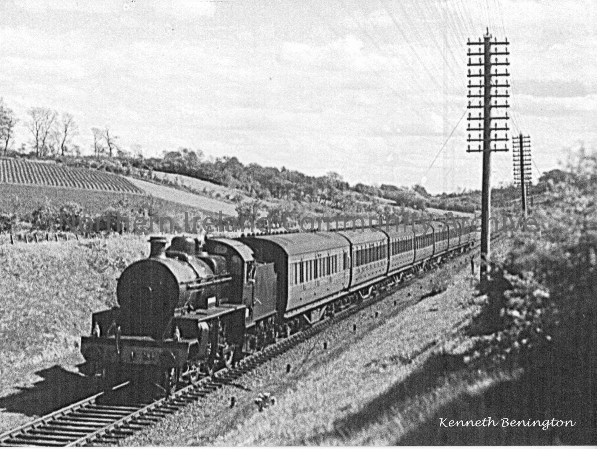 WT class 2-6-0 No.91 ‘The Bush’ travels down the Ballymoney bank towards Ballyboyland level crossing