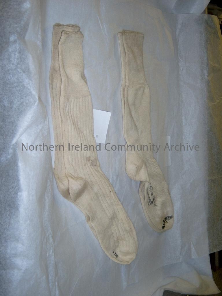 ww2 2 pairs of cream woollen socks. One pair marked All pure wool, made in Australia. Fit wear 11 ½. Other pair are ribbed in design and marked 11 ½ on sole of foot. Both pairs are stapled together.