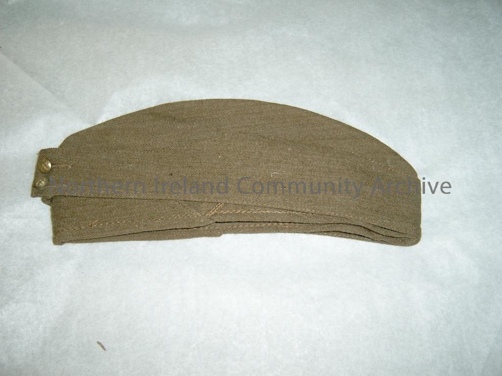 ww2 khaki military hat. Marked inside Collett ltd, 7 ¼ 1943. 2 brass buttons with crest (5627)