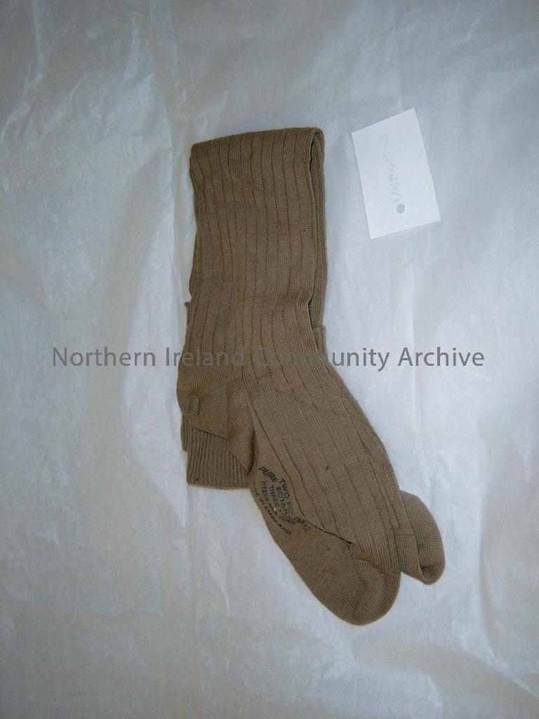 ww2 pair of khaki military socks marked on foot Two fold pure botany wool. Three fold heels and ties. Made in England. (5127)