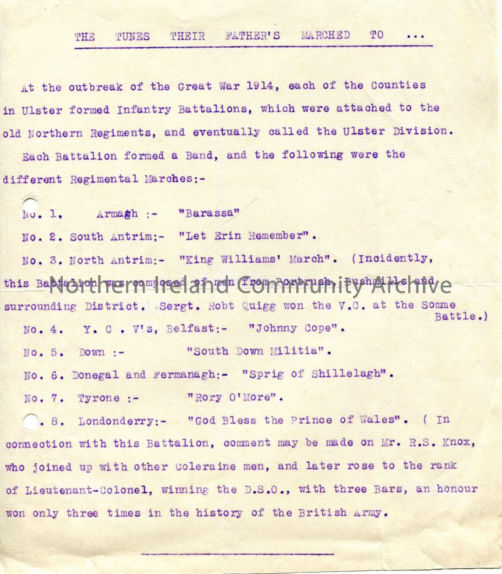 Typed information on regimental marches for WWI battalions in Ulster Division, including notes on Robert Quigg V C of Bushmills and R S Knox from Coleraine area, who won DSO with 3 bars (at time of Sam writing, only won 3 times in history of British Army)
