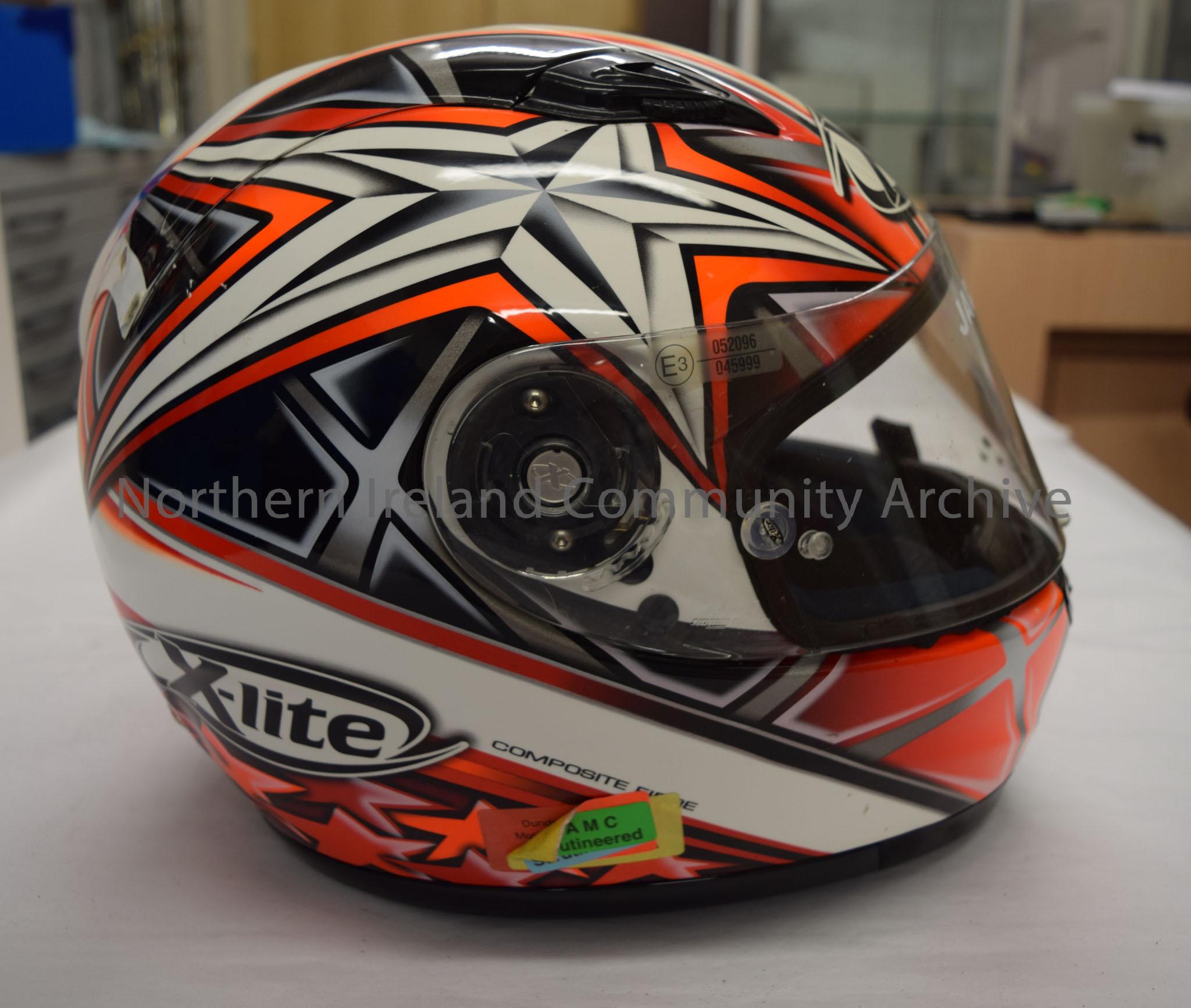 X-lite motorcycle helmet belonging to Jack Sands. Helmet with white stripe down the middle with an orange, red, grey and black pattern and white, black and grey stars on the sides.