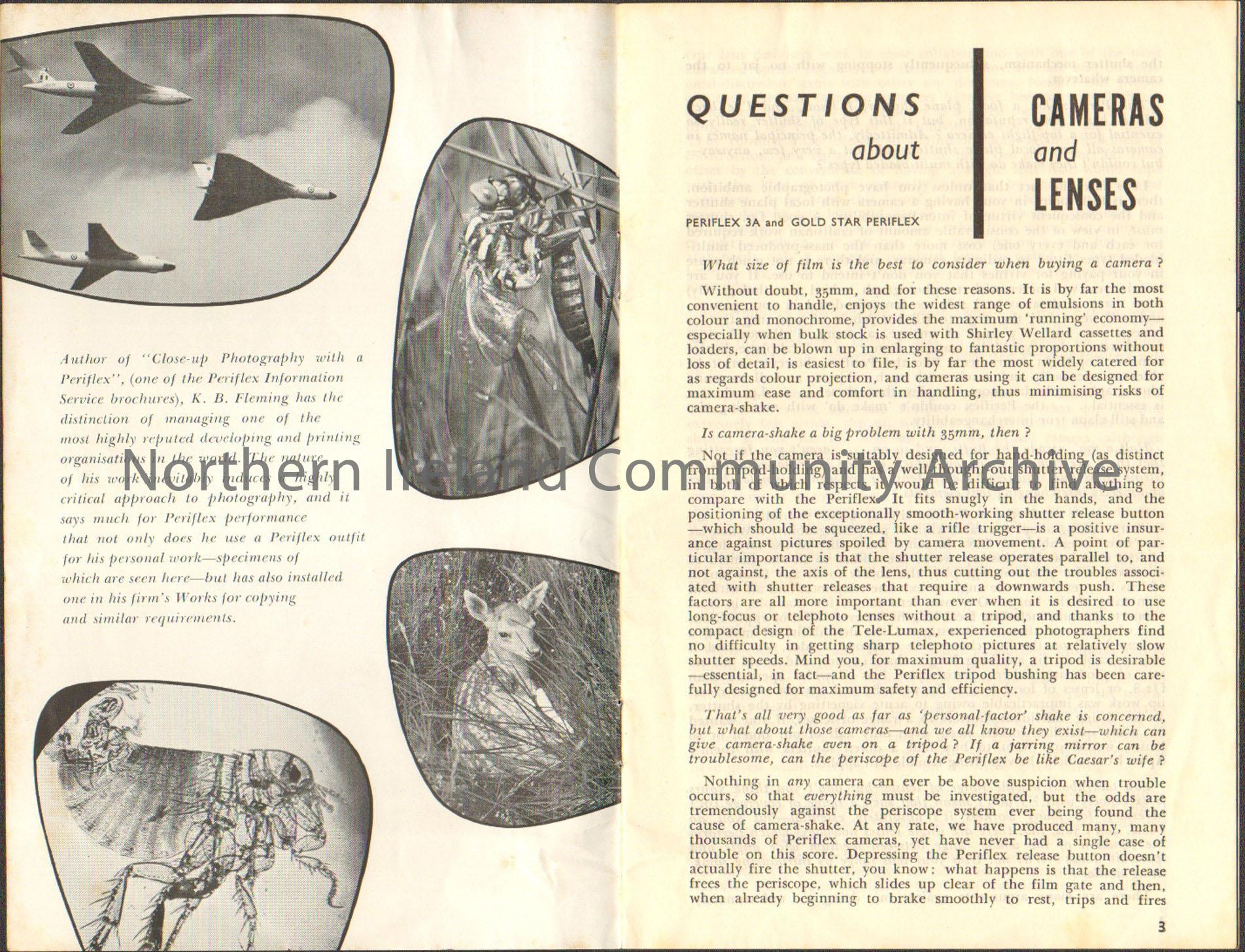 Yellow booklet "Questions about cameras and lenses" with picture of Corfield Factory, Ballymoney on the front