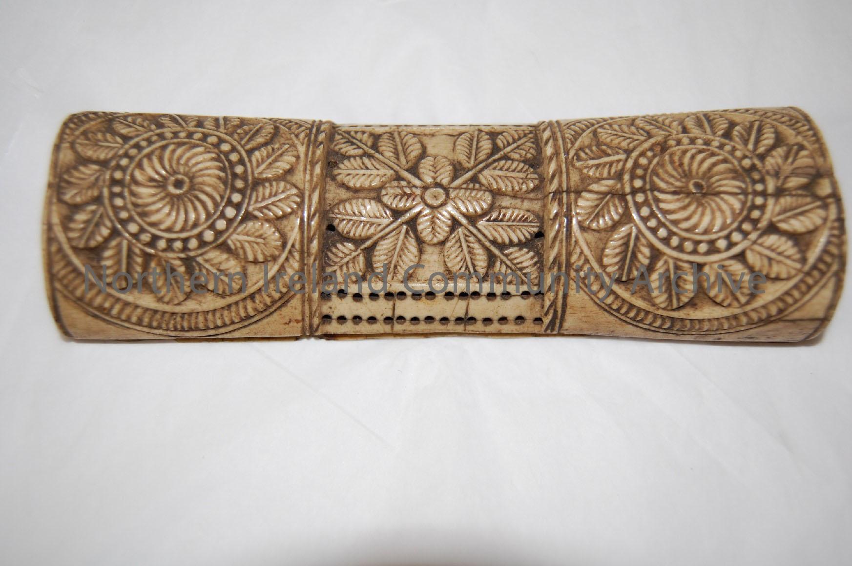 Yellow coloured section of bone with semi-circular section and patterns carved into it.