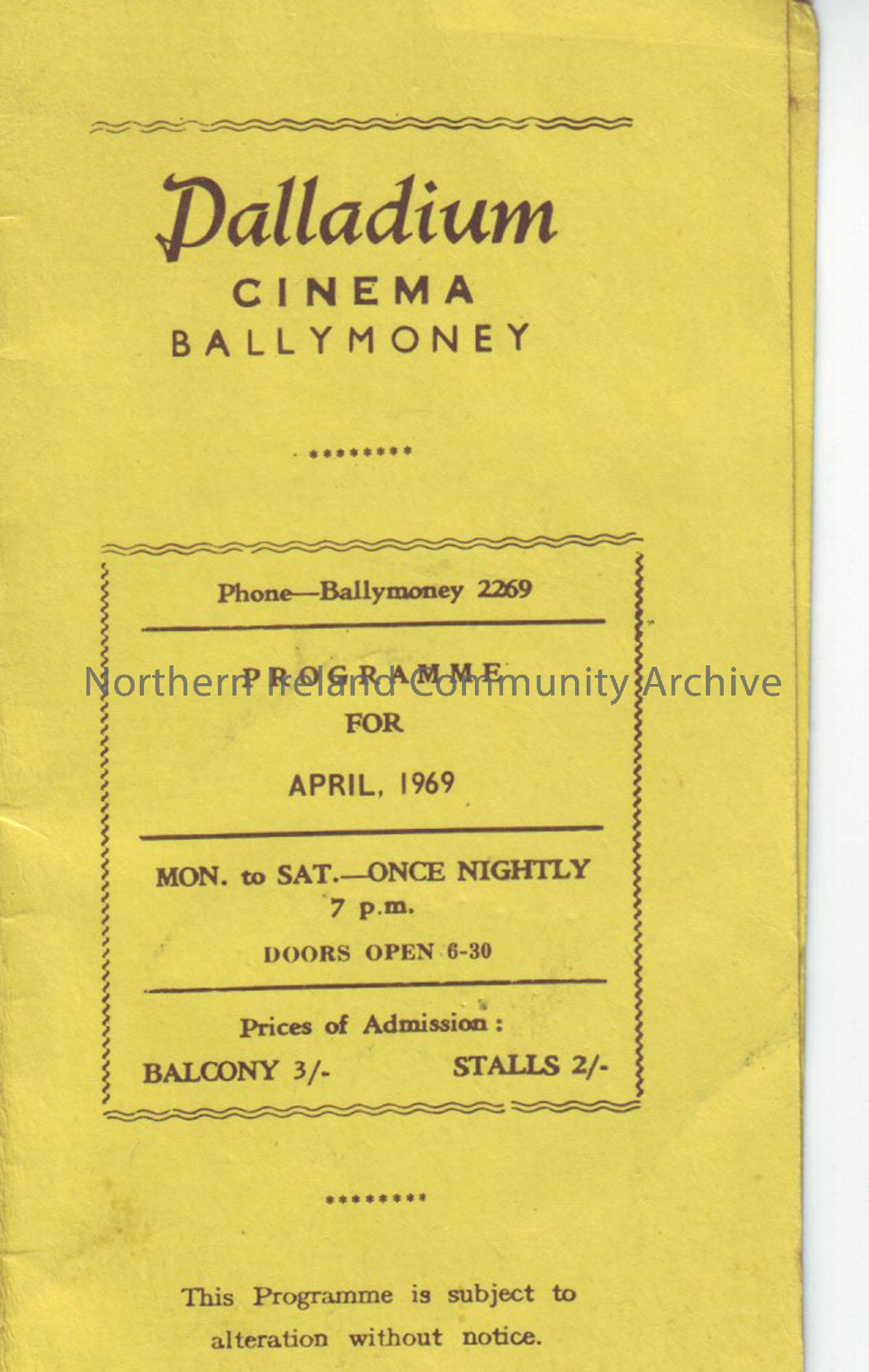yellow monthly programme for Ballymoney Palladium cinema- April 1969