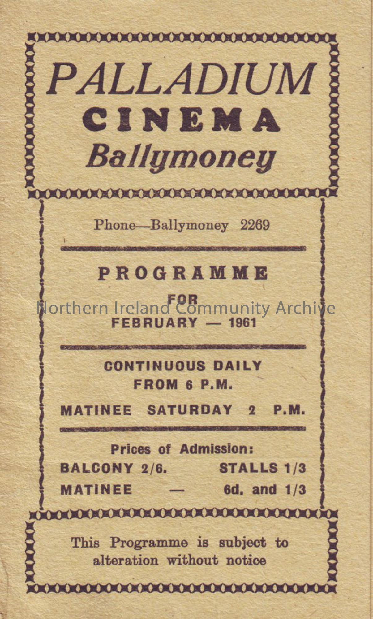 yellow monthly programme for Ballymoney Palladium cinema- February 1961