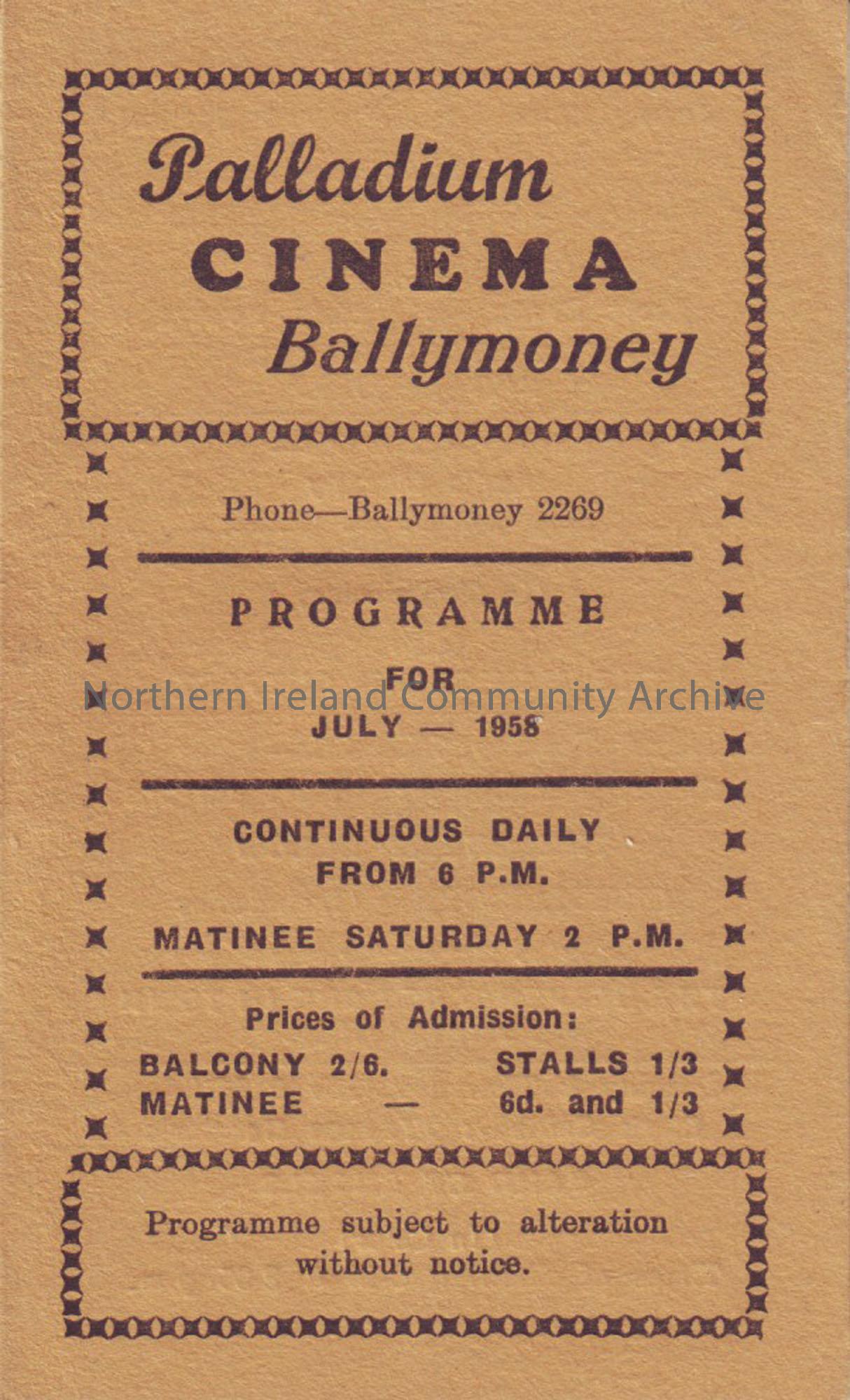 yellow monthly programme for Ballymoney Palladium cinema- July 1958