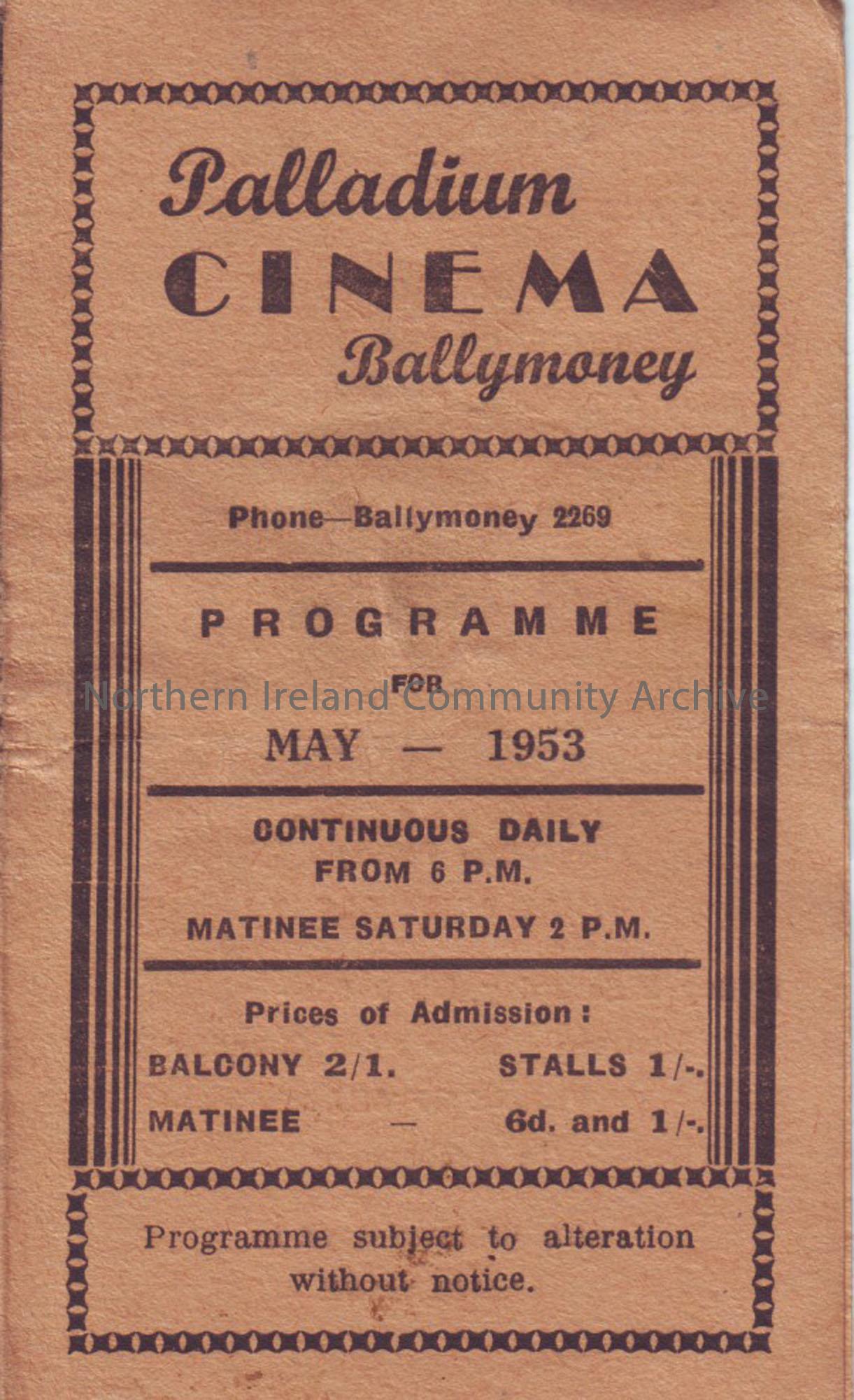yellow monthly programme for Ballymoney Palladium cinema- May 1953