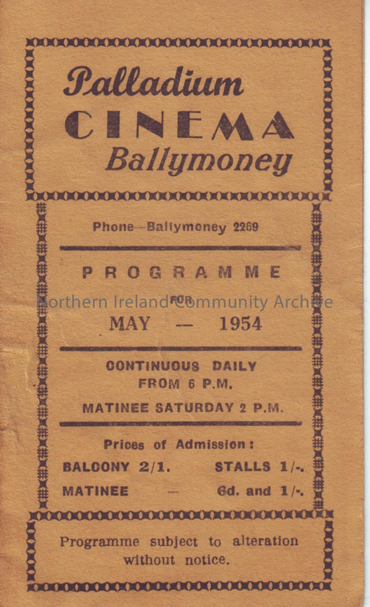 yellow monthly programme for Ballymoney Palladium cinema- May 1954