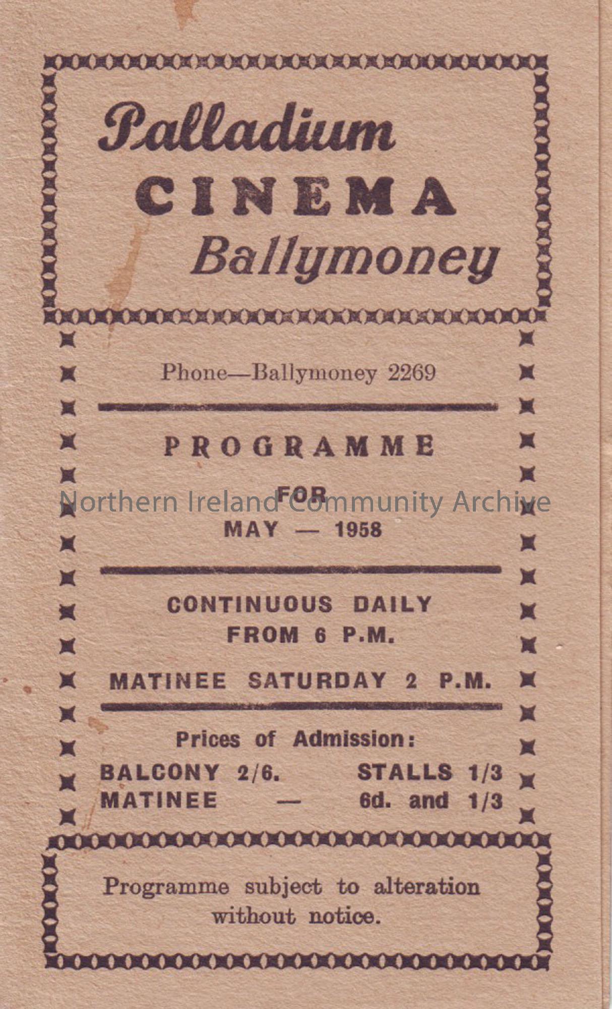 yellow monthly programme for Ballymoney Palladium cinema- May 1958