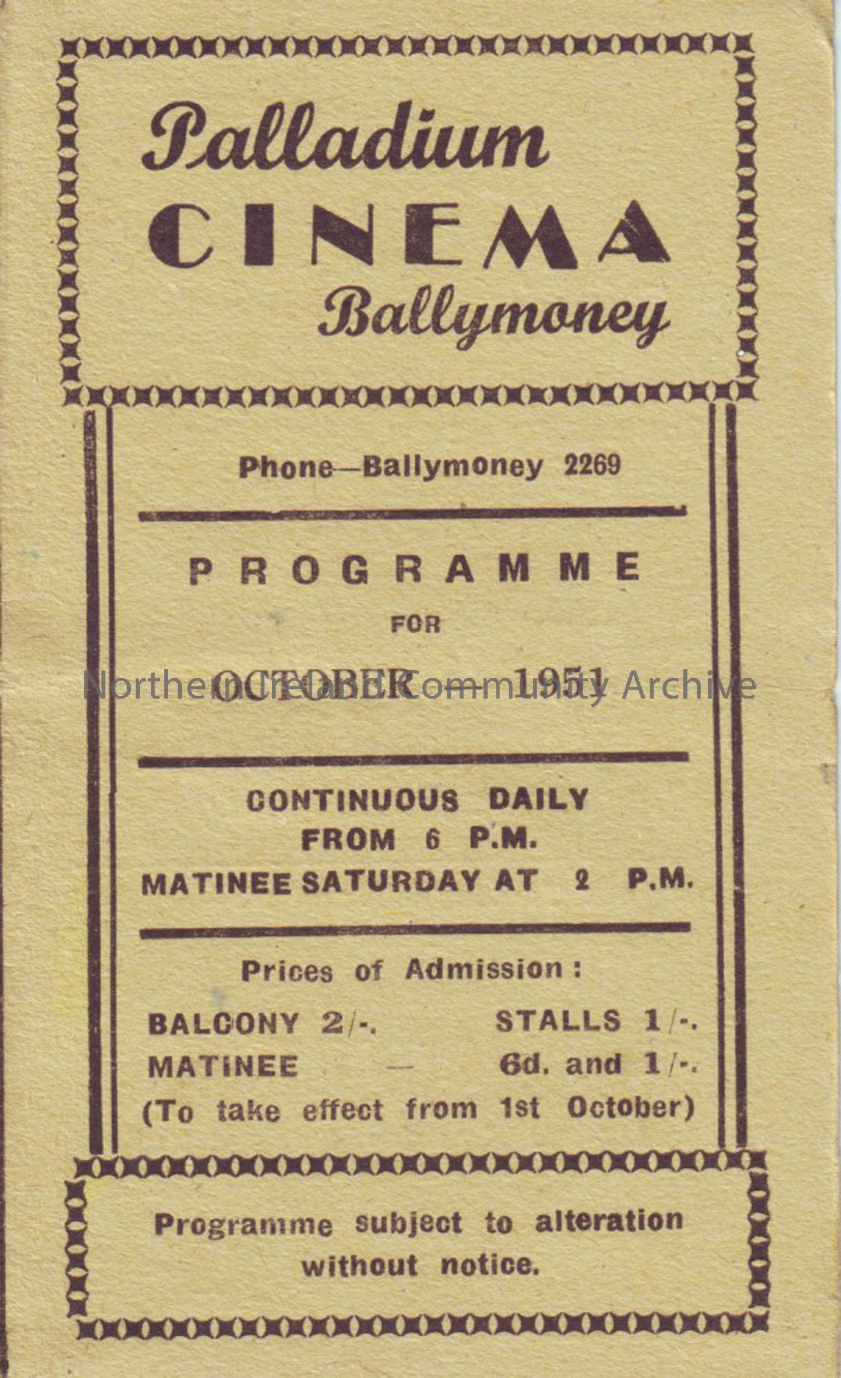 yellow monthly programme for Ballymoney Palladium cinema- October 1951