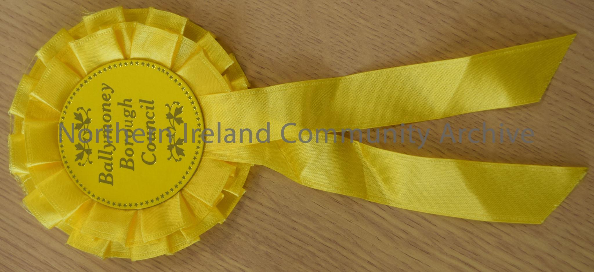Yellow rosette with two yellow ribbons. On the face of the rosette in gold writing states 'Ballymoney Borough Council' with a gold floral design at the top and bottom as well as gold stars round the outer edge. The back of the rosette is a silver coloured safety pin.
