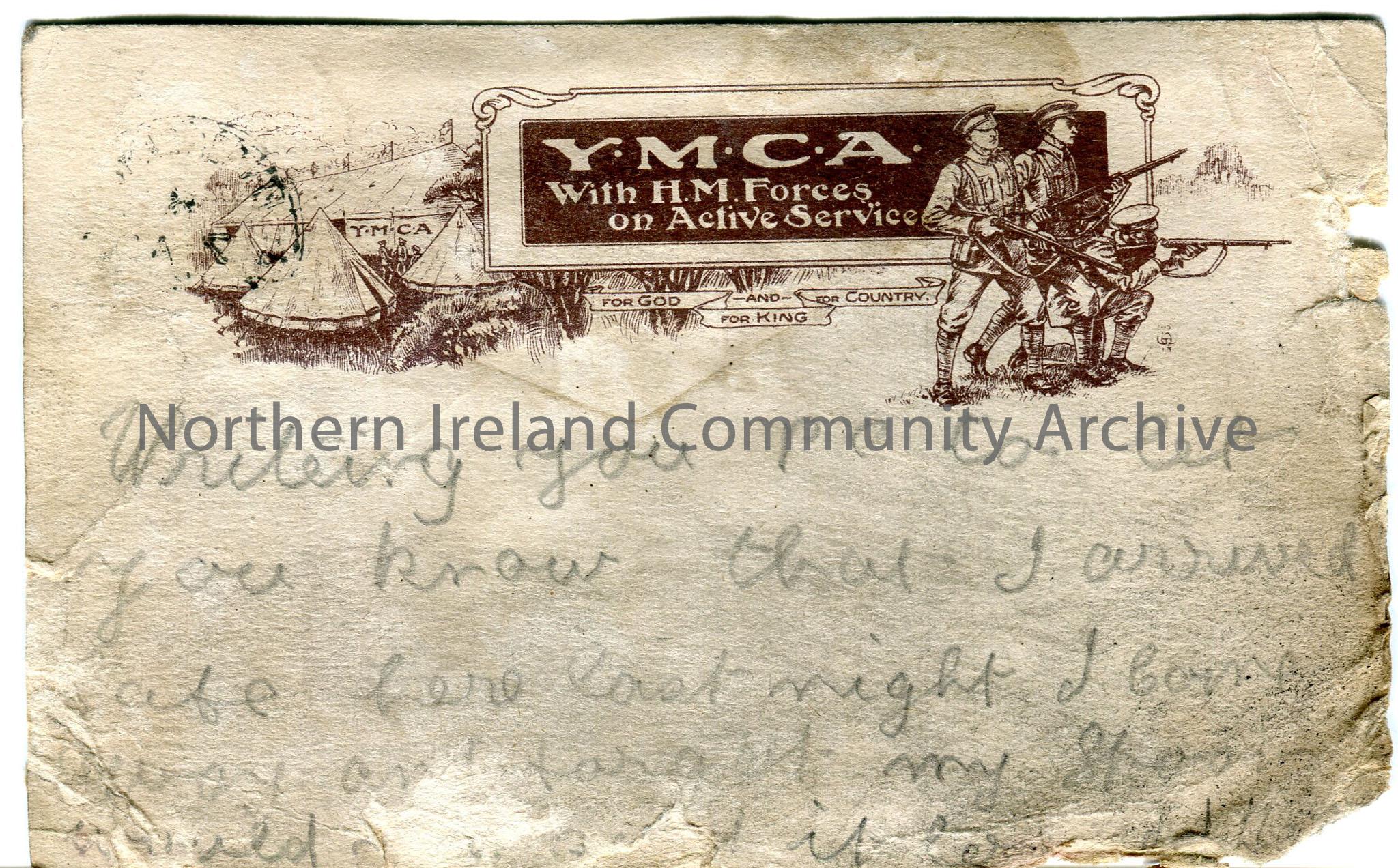 ‘YMCA with HM Forces on Active Service’ postcard from James to his father, arrived safe in Finner Camp – has forgotten to take spoon with him