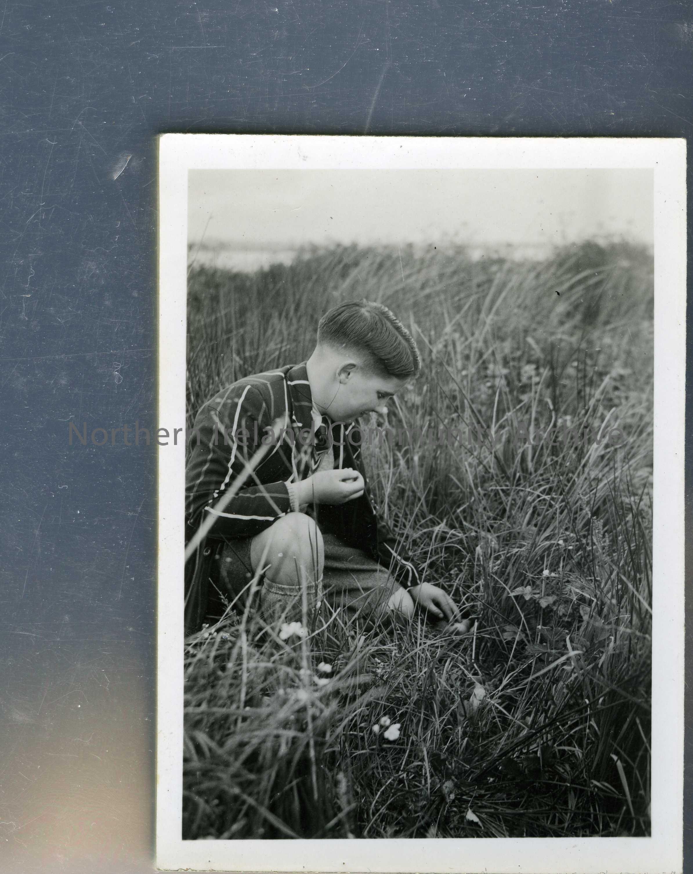 Young boy in a school uniform kneeling among long grass. Captioned, ‘Tufted Ducks nest Kinturk flat Lough Neagh’.