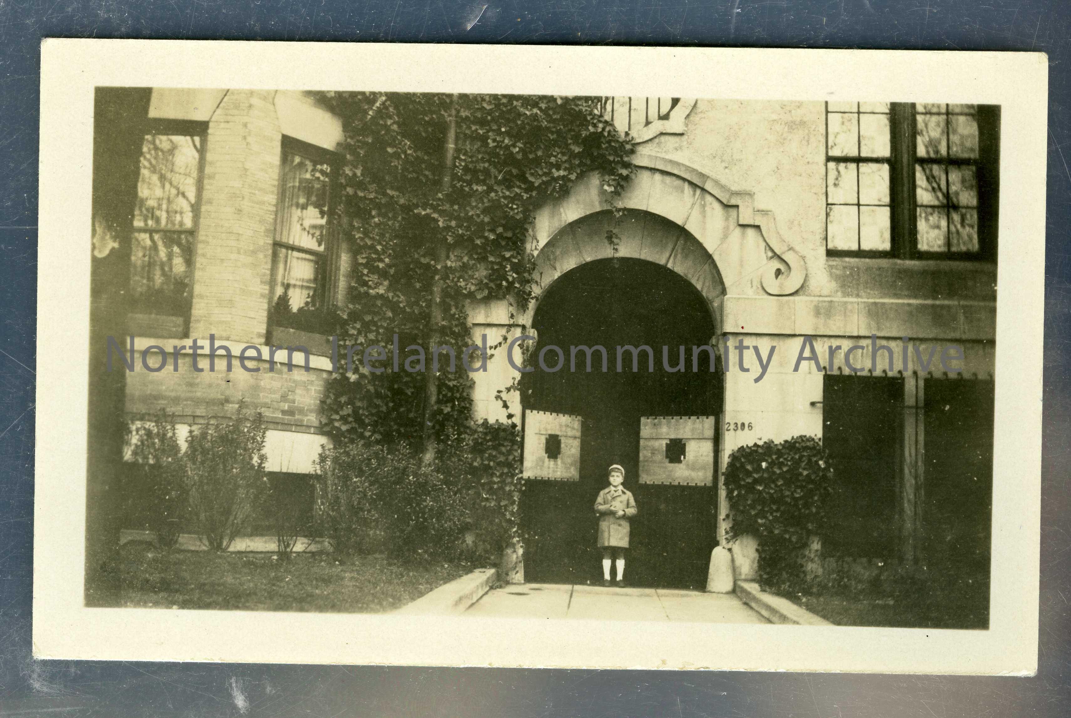 Young boy standing in front of a large building. Handwritten caption on reverse, ‘Mallery House’.