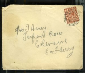 Curious to learn more, I began with the 1911 Irish census. The Henry family lived at house 22 in Castleroe: James, his parents Alexander and Anabella, sister Georgina, and brothers Alex and William Irwin. At 18, James worked as a Water Bailiff, while his father was a gardener. Though the letters are addressed to Taylor’s Row, the 1915 Roll of Honour and James’s death notice list the family’s address as Chapel Square—two streets that adjoin.