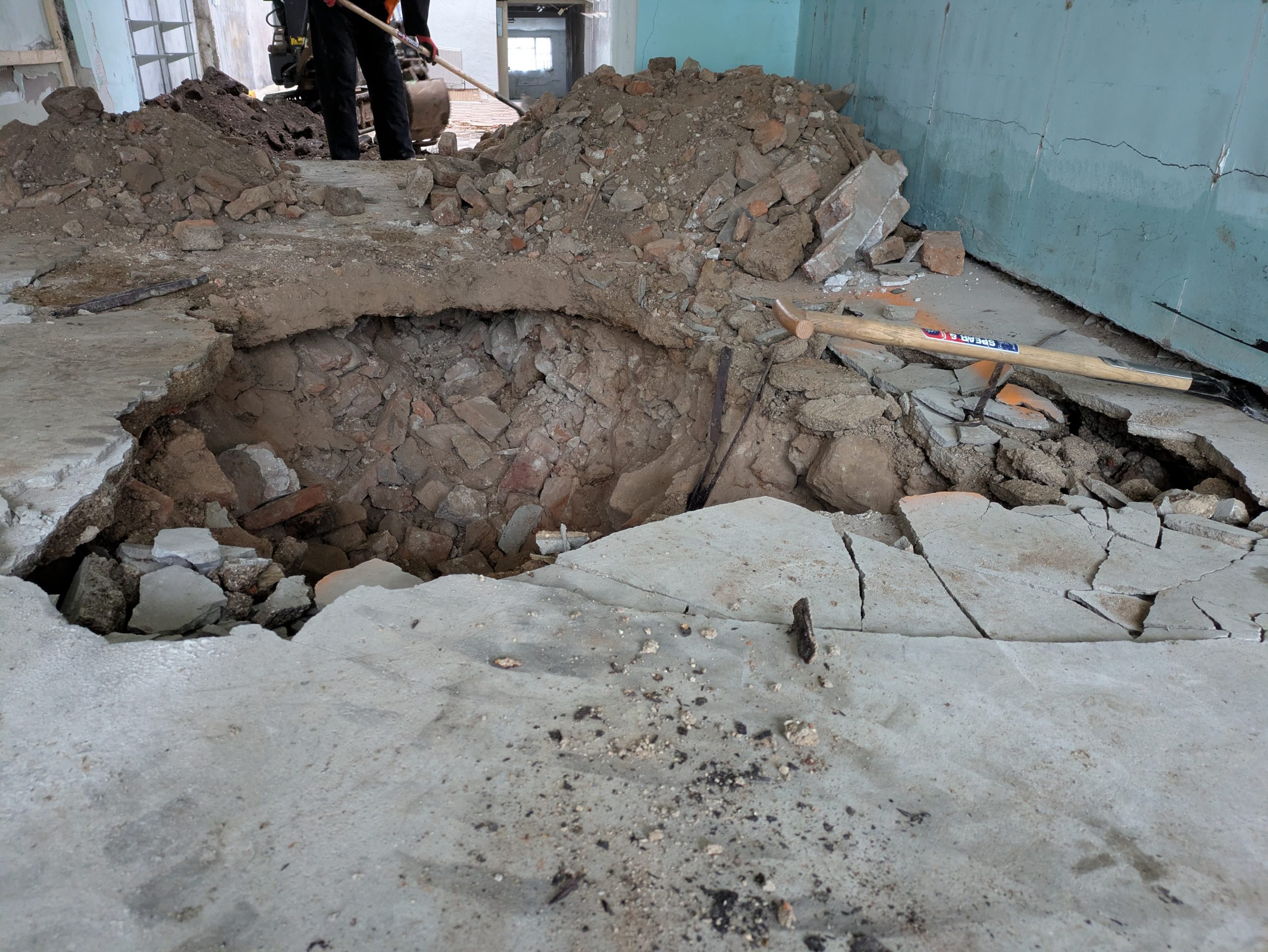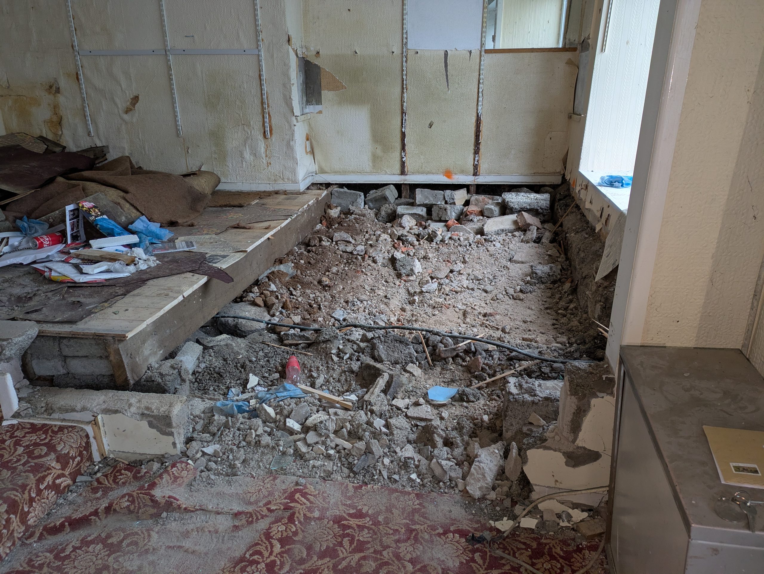 During renovations c.1960 Jimmy got the cellar filled in with rubble and covered over with concrete but the doorway and steps still remain under the present surface (this void was exposed during site investigations in 2026 but was so loosely packed that it became dangerous and had to be back-filled).