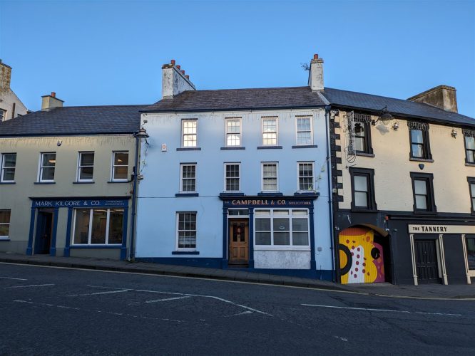 SMcM research based on Griffith’s Valuation registers. According to Patricia Duffin (email 04/03/25) “My grandfather continued to live there. He was a well respected cattle dealer and on occasion bought cattle and sheep for Lord Glentoran who “used Clare Park for big parties”. The majority of the ground floor was a butchers shop. My grandfather died in 1951 [later email 19/06/25 corrected this to September 1946] and the shop continued for a short time after that. “His brother, Joey, owned The Boyd Arms which was just below the family home. “My Aunt sold the building in 19. to the firm of solicitors who, I believe still occupy it. Below the large front window was a marble inset with the word McAuley carved in gold letters. I believe that after the sale this was turned around to present a blank frontage.” |